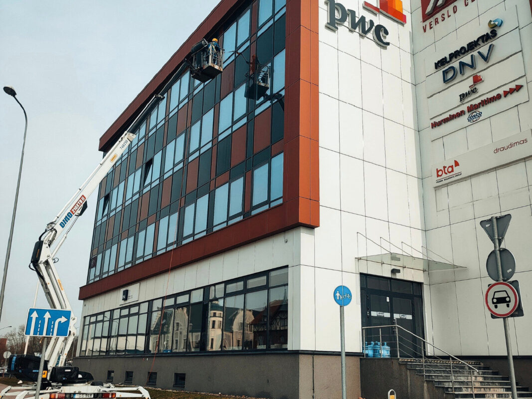 - Reguliarus valymas, ypač stiklinėms fasado dalims ar langams, kad išlaikytumėte pastato estetiką ir priežiūrą.
